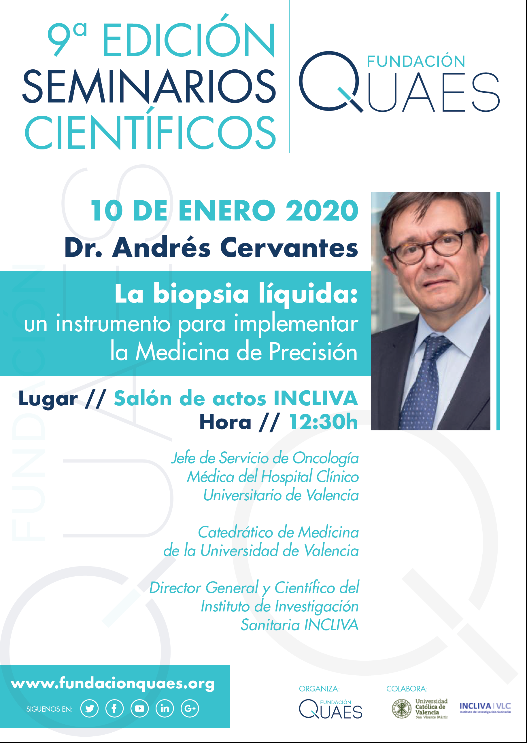 El próximo 10 de enero de 2020 se celebra el primer seminario de la Fundación QUAES para el curso 2020, se trata ya de su 9 ª Edición de esta actividad y este año hemos querido que comience con una charla del Dr. Andrés Cervantes con el título: » La biopsia líquida: un instrumento para implementar la Medicina de Precisión»