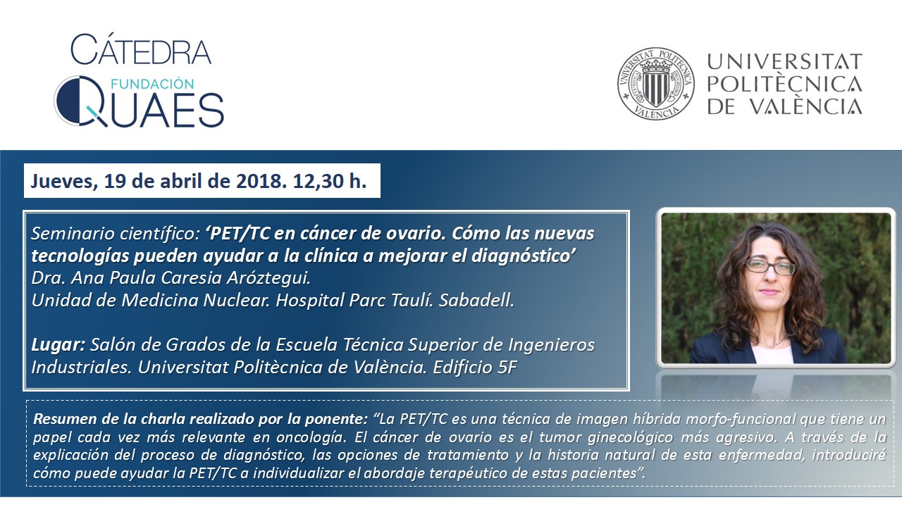 El próximo 19 de abril, dentro del programa de actividades de la Cátedra QUAES-UPV, tenemos una interesante charla de la Dra. Ana Paula Caresía en la que abordará el tema del cáncer de Ovario desde la óptica de la Medicina Nuclear. La charla lleva por título: ‘PET/TC en cáncer de ovario. Cómo las nuevas tecnologías pueden ayudar a la clínica a mejorar el diagnóstico’.
