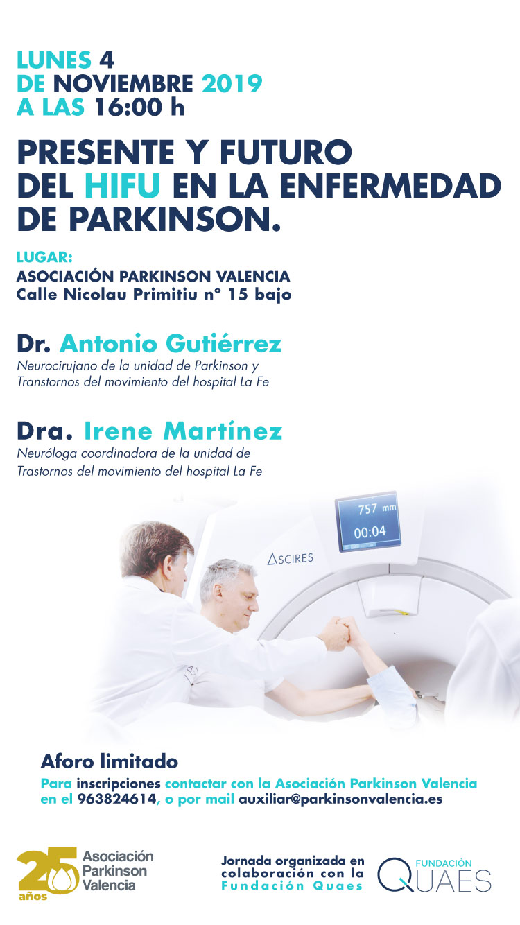 La Fundación QUAES en colaboración con la Asociación de Parkinson Valencia organizan una interesante charla sobre el tratamiento HIFU aplicado a la enfermedad de Parkinson, será el próximo 4 de noviembre en la sede de la Asociación.