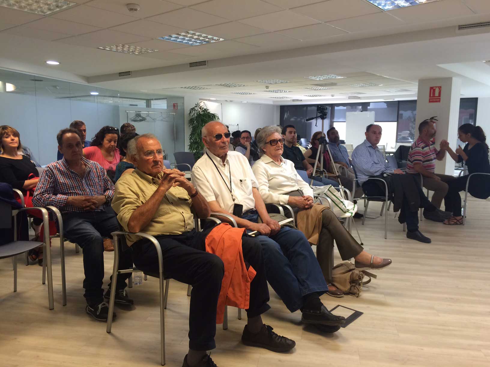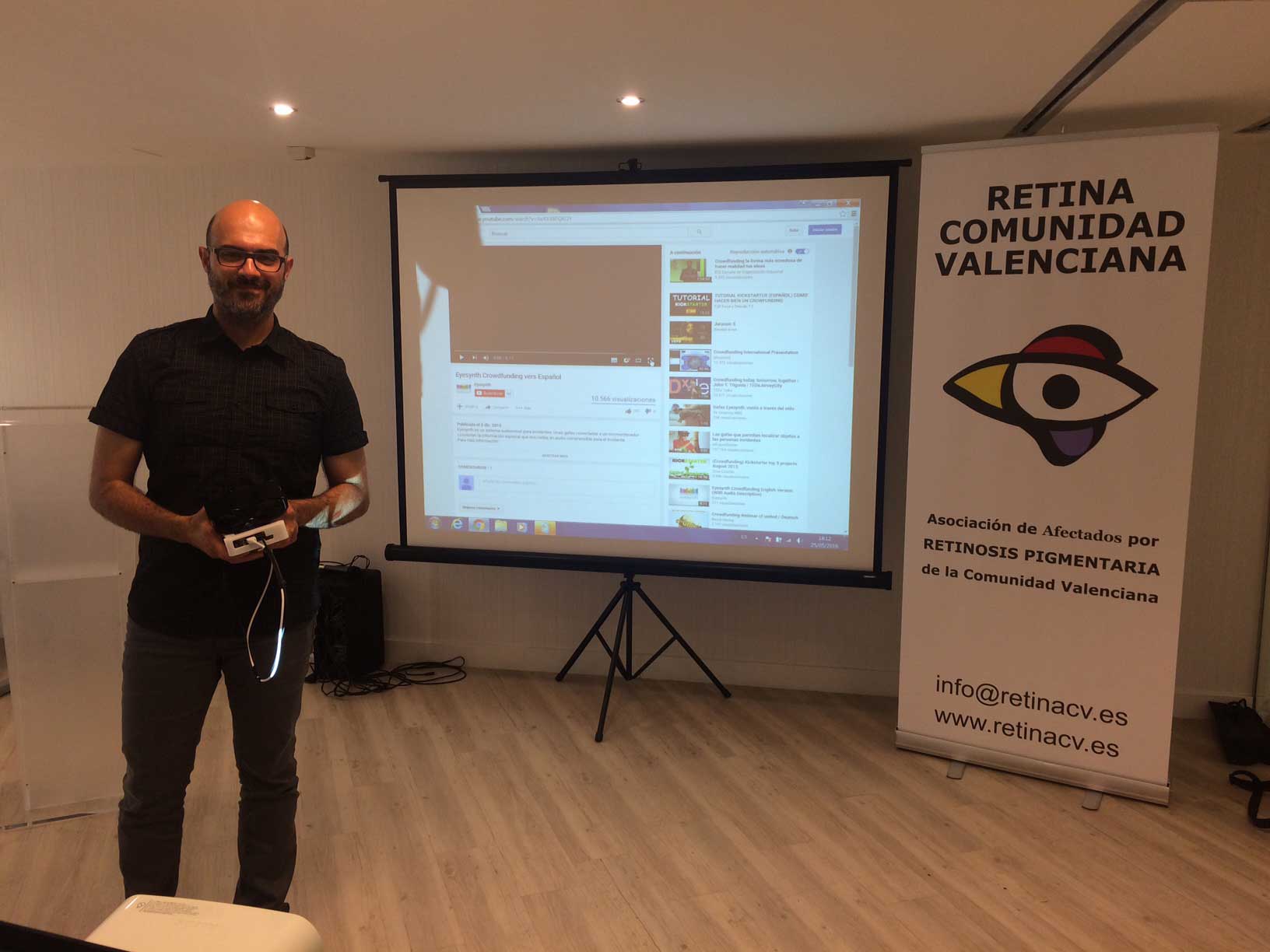 Una treintena de miembros de la Asociación de Retinosis Pigmentaria estuvieron el miércoles 25 de mayo en la sede de Fundación QUAES. El objetivo de la reunión era presentarles con una charla didáctica un nuevo dispositivo tecnológico que ayuda a la baja visión o incluso a la invidencia. La conferencia tenía por nombre “Gafas 3D para ver escuchando” y fue ofrecida por Antonio Quesada, fundador de la empresa Eyesynth.