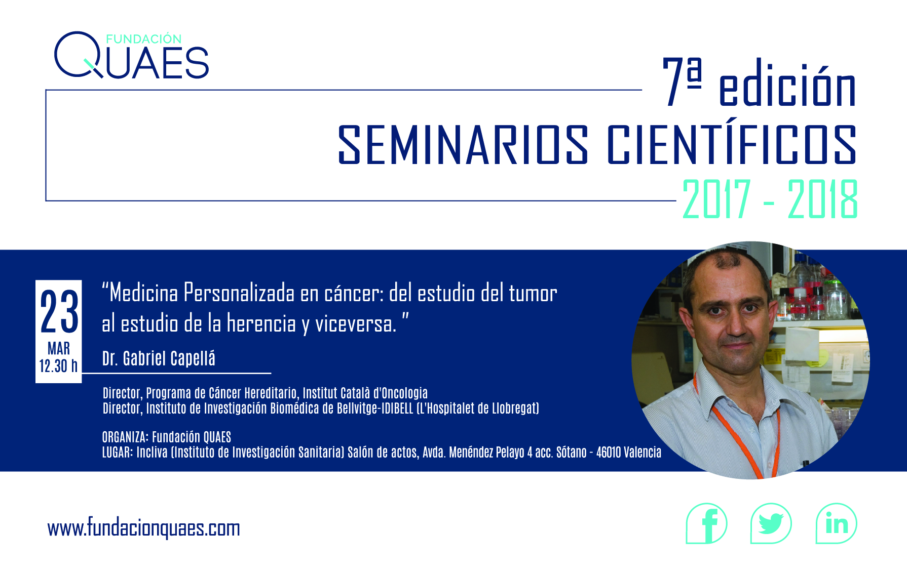 El próximo 23 de marzo en el Salón de Actos del Incliva se celebrará el tercer Seminario Científico de 2017 de la Fundación QUAES. En esta ocasión, y tras las charlas de los doctores Tarón y Rodríguez Mañas, le toca el turno al Dr. Gabriel Capellá que hablará sobre uno de los temas que más páginas están llenando en los medios especializados en medicina. El Dr. Capellá hablará sobre medicina personalizada en el cáncer de lo que es un verdadero experto.