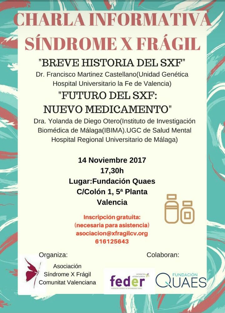 Os esperamos a todos el próximo día 14 en nuestra sede con una jornada que ha organizado la Asociación X Frágil Valencia. Las charlas las van a dar el Dr. Francisco Martínez Castellano de Hospital Universitari i Politècnic La Fe de Valencia y de la Dra. Yolanda de Diego Otero del IBIMAde Málaga. Os podéis inscribir en la siguiente dirección: asociacion@xfragilcv.org