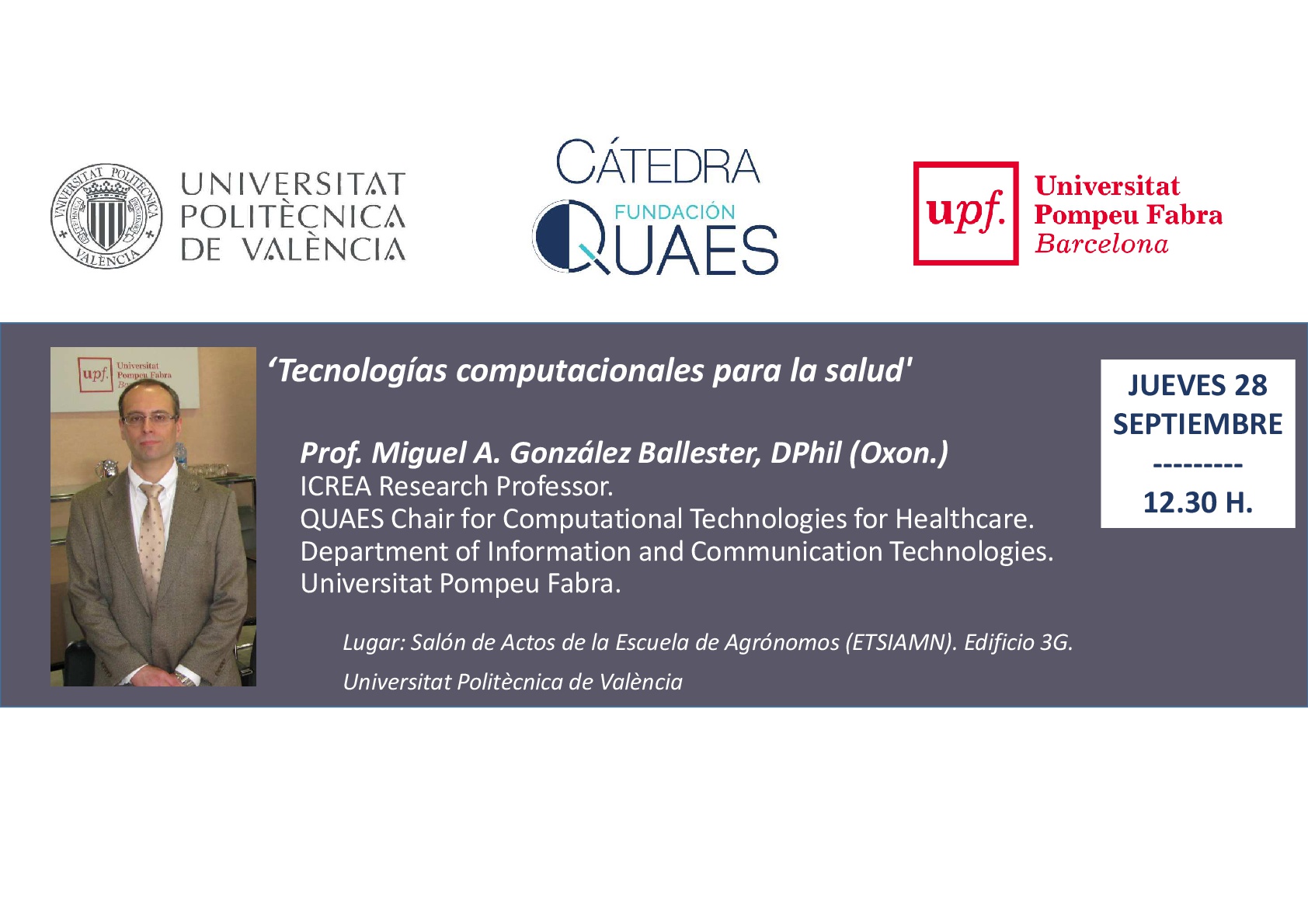El próximo jueves 28 de septiembre tenemos en la Universitat Politècnica de València (UPV) un seminario sobre ‘Tecnologías computacionales para la salud’. La charla será impartida por el Prof. Miguel A. González Ballester, DPhil (Oxon.) ICREA Research Professor. QUAES Chair for Computational Technologies for Healthcare. Department of Information and Communication Technologies de la Universitat Pompeu Fabra (UPF).