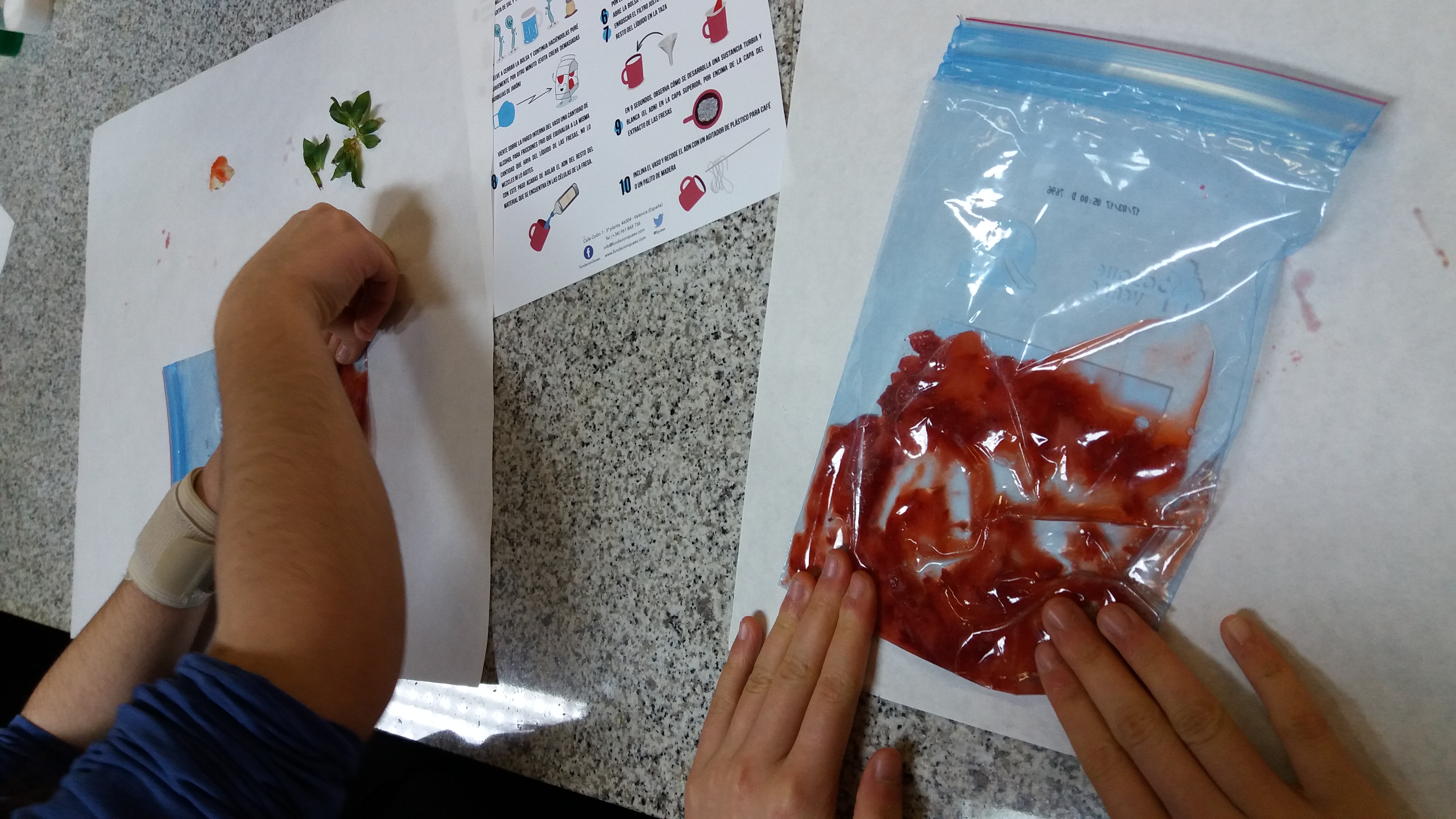 Al alumnado de Mestalla se les ha dado una teórica adaptada a sus conocimientos por lo que hemos hecho dos folletos diferentes para la clase, mientras que todos compartieron la ficha de la práctica en la que se les daba las dos opciones: una es la extracción del ADN de la propia saliva de cada uno de los participantes y la otra opción es la de sacar el ADN de una fresa. Los colegios eligen el tipo de práctica que quieren hacer.