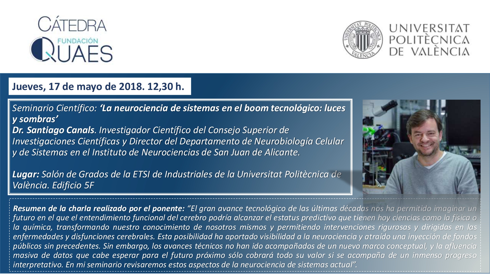 El jueves 17 de mayo a las 12.30 horas os invitamos a un nuevo Seminario de la Cátedra Fundación QUAES-UPV. En esta ocasión será el Dr. Santiago Canals, investigador Científico del Consejo Superior de Investigaciones Científicas y Director del Departamento de Neurobiología Celular y de Sistemas en el Instituto de Neurociencias de San Juan de Alicante, quien nos visitará. Para la ocasión ha preparado una conferencia que lleva por título: ‘La neurociencia de sistemas en el boom tecnológico: luces y sombras’.