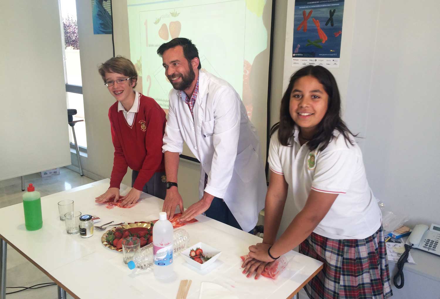 El primero de los experimentos ha consistido en extraer el ADN de una fresa rompiendo las moléculas y realizando diferentes procesos hasta obtener las fibras de ADN de la fresa.