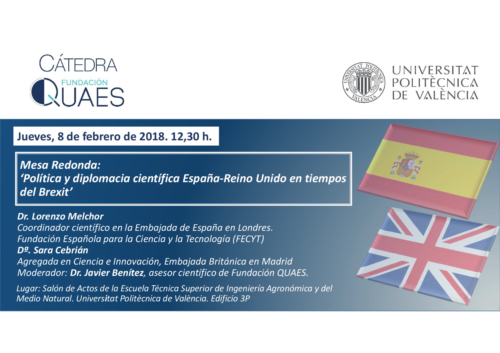 El próximo 8 de febrero en el marco de la Cátedra Fundación QUAES-UPV vamos a entender un poco mejor como se relacionan el mundo de la ciencia con la diplomacia, algo que puede parecer en principio lejano, pero que tiene realmente un largo recorrido histórico y una amplia utilidad y, por supuesto, puede ser un futuro profesional para actuales estudiantes. La mesa en la que se abordará este temática lleva por título ‘Política y diplomacia científica España-Reino Unido en tiempos de Brexit’. La charla se celebra a partir de las 12.30 horas en el Salón de Actos de la Escuela Técnica Superior de Ingeniería Agronómica y del Medio Natural (edificio 3P) de la Universitat Politècnica de València.
