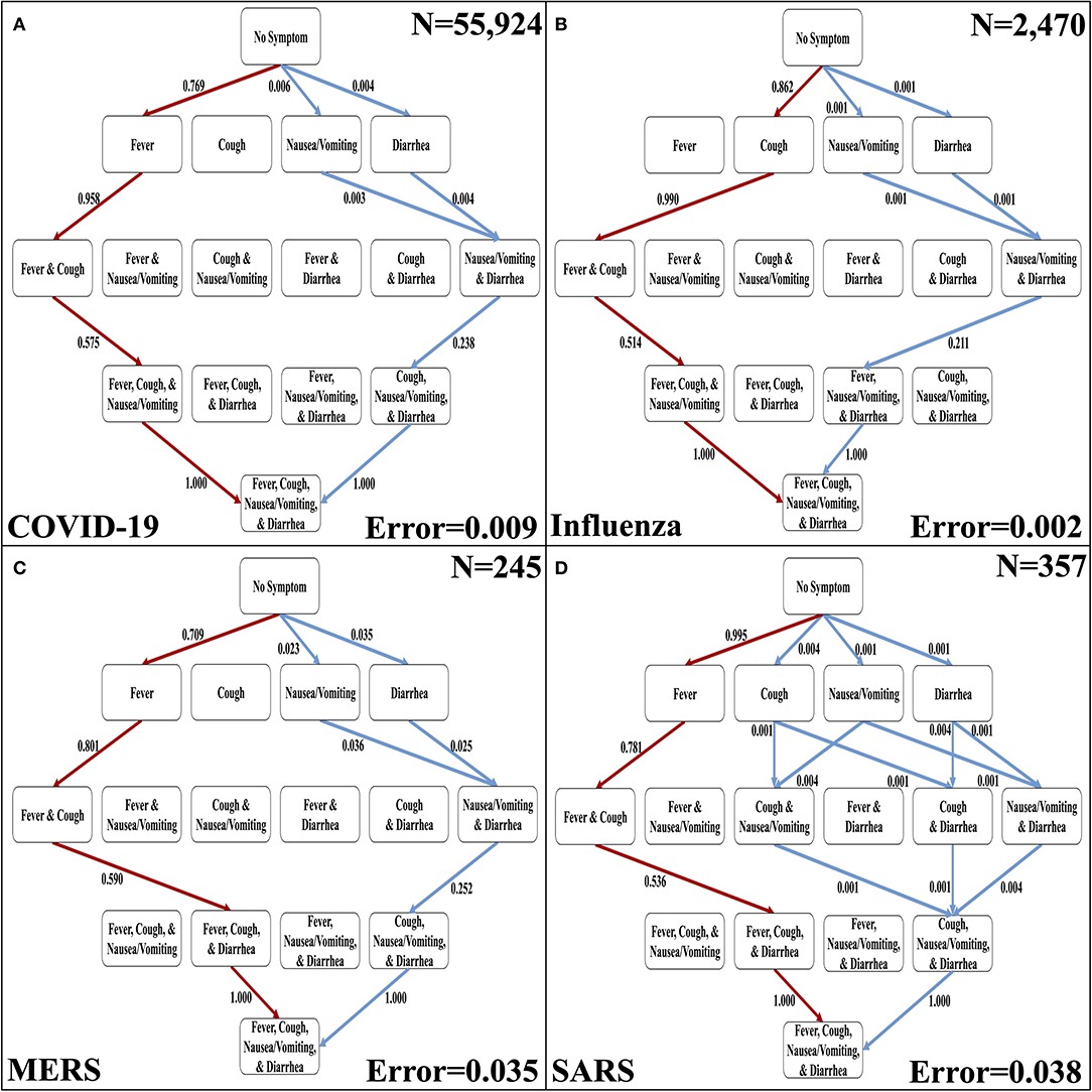 Datos obtenidos por revisión bibliográfica referentes a la frecuencia de los síntomas en COVID-19, influenza, MERS y SARS. Cada conjunto de datos se utilizó para aproximar el orden de los síntomas, para confirmar los resultados o para analizar los primeros síntomas en COVID-19 o influenza.