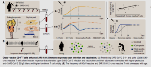 Este trabajo estudia la relevancia funcional de la inmunidad cruzada preexistente para el síndrome respiratorio producido por SARS-CoV-2. Los resultados muestran que las células T CD4+, reactivas frente a coronavirus endémicos, que presentan reacción cruzada frente al SARS-CoV-2, son omnipresentes pero disminuyen con la edad.