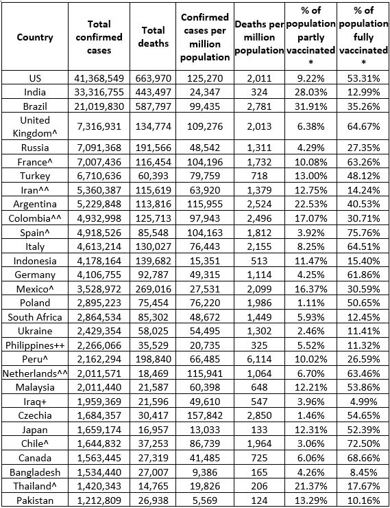 ^ Vaccination data as of September 13; ^^ vaccination data as of September 12; + vaccination data as of September 8; ++ vaccination data as of August 15.