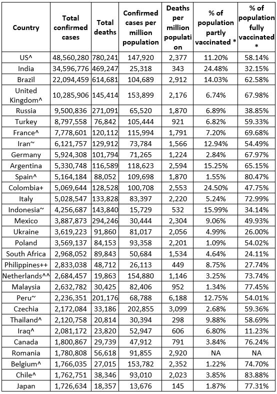 * Data sourced from https://ourworldindata.org/covid-vaccinations#source-information-country-by-country and are as of November 30, unless otherwise indicated; A person is considered partly vaccinated if they have received only one dose of a 2-dose vaccine protocol. A person is considered fully vaccinated if they have received a single-dose vaccine or both doses of a two-dose vaccine.