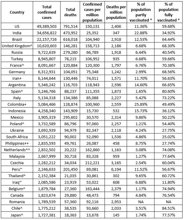 * Data sourced from https://ourworldindata.org/covid-vaccinations#source-information-country-by-country and are as of December 7, unless otherwise indicated; A person is considered partly vaccinated if they have received only one dose of a 2-dose vaccine protocol. A person is considered fully vaccinated if they have received a single-dose vaccine or both doses of a two-dose vaccine. ^ Vaccination data as of December 6; + vaccination data as of December 5; ~ vaccination data as of December 4; ^^ vaccination data as of November 28; ++ vaccination data as of November 11. NA: Data not available on Our World In Data site. Reference: https://coronavirus.jhu.edu/map.html SOURCE: Johns Hopkins University CSSE; Our World in Data