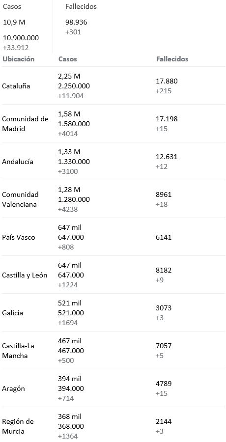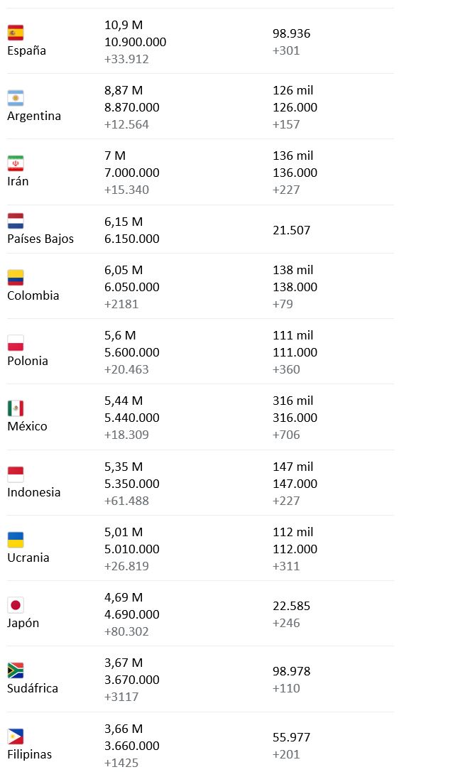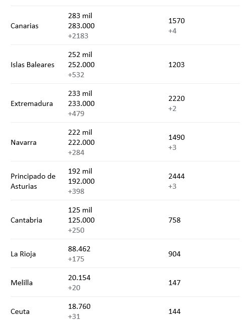 El signo más (+) indica los casos nuevos confirmados respecto al día anterior