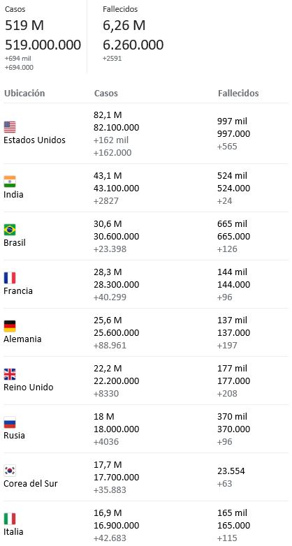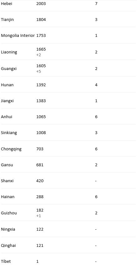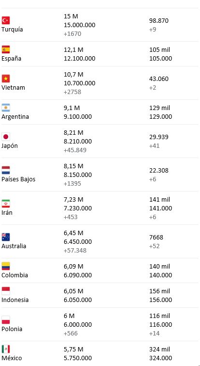 El signo más (+) indica los casos nuevos confirmados respecto al día anterior.