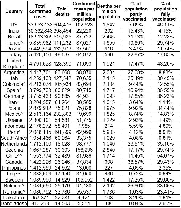 Global case count (as of June 30, 09:21 ET): 181,912,043 confirmed cases; 3,940,071 deaths (2.2%). The following are the 30 countries with the highest case counts as of June 30, 09:21 ET.