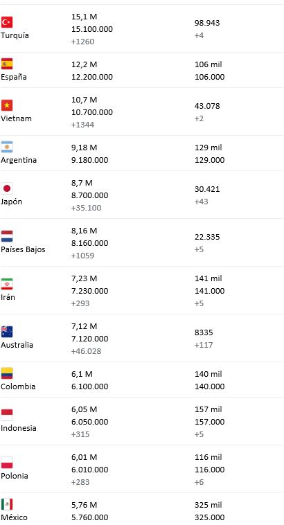 El signo más (+) indica los casos nuevos confirmados respecto al día anterior·