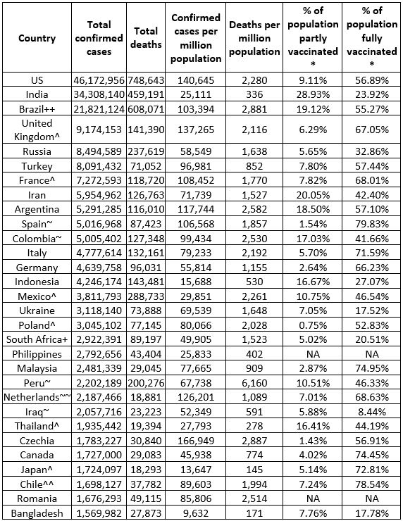 ^ Vaccination data as of November 1; + vaccination data as of October 31; ~ vaccination data as of October 30; ^^ vaccination data as of October 29; ++ vaccination data as of October 27; ~~ vaccination data as of October 24.