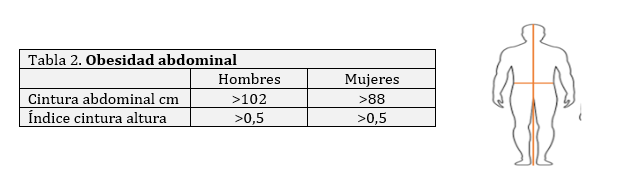 El tejido graso tiene numerosas funciones y son dependientes de las zonas donde se acumula la grasa, el acúmulo más peligroso es en el abdomen (obesidad abdominal) este tipo de obesidad abdominal, la detectamos en clínica por diferentes métodos (tabla 2). El más usado y simple ha sido la cintura abdominal (perímetro en el punto medio entre el borde inferior de la última costilla y la cresta ilíaca o cadera) y más recientemente se prefiere al índice cintura / altura.