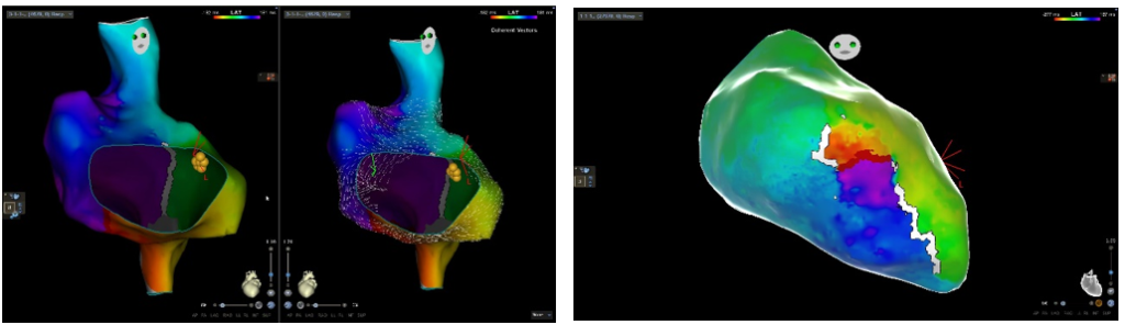 (Izquierda: Mapas de activación en un flutter auricular. Derecha: Mapa en una taquicardia ventricular)