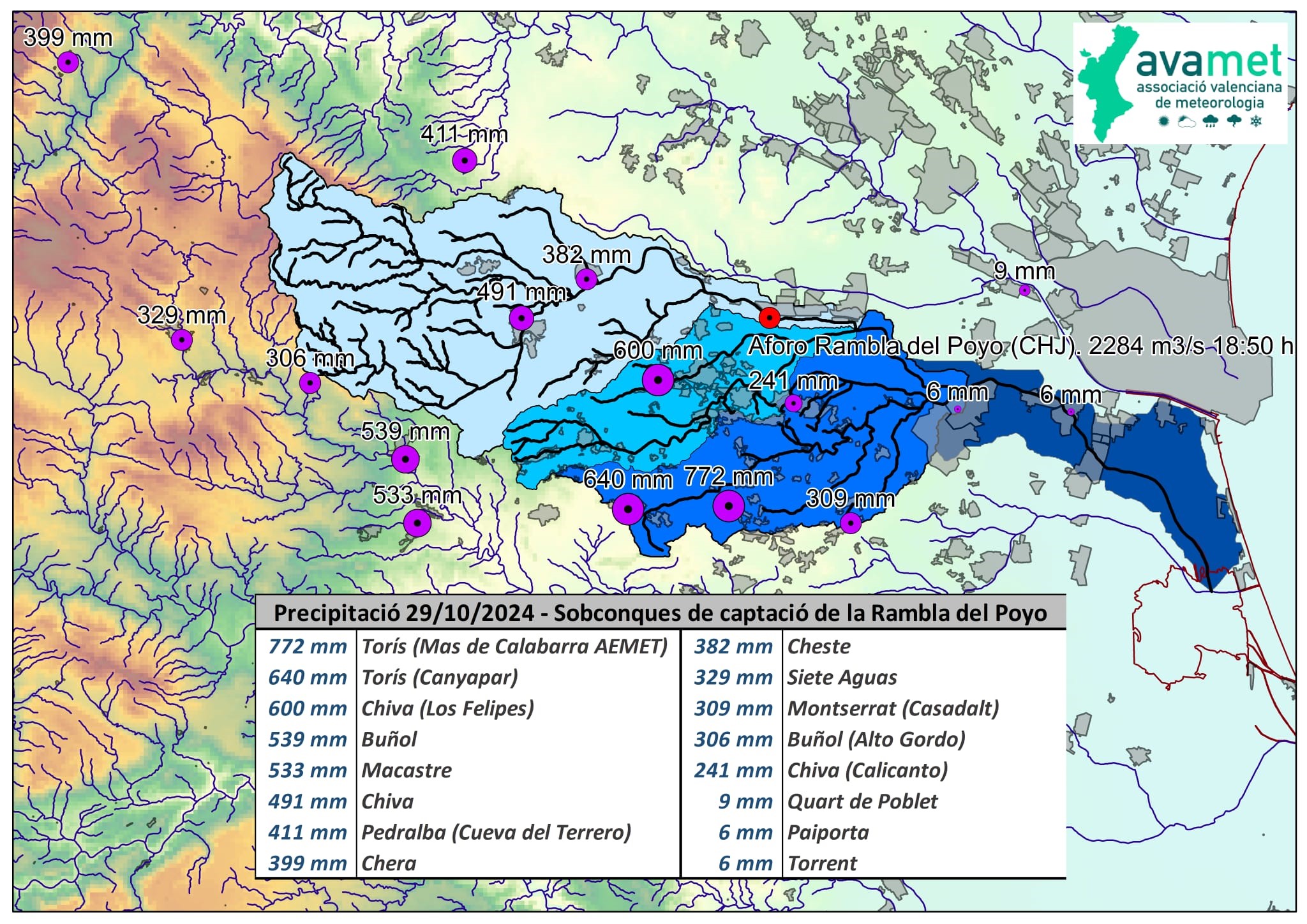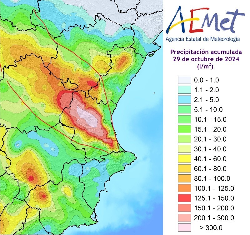 Las cantidades de lluvia totalizadas en pocas horas fueron espectaculares, superando en muchos casos los registros más altos de que había constancia. En torno a 300 l/m2 en Requena-Utiel (río Magro) al inicio del episodio, 411 en Pedralba (río Turia) al final. Pero en medio alcanzó sus máximos valores en la cuenca de la Rambla del Poyo: más de 500 l/m2 en Chiva, y hasta cerca de 800 en puntos del término de Torís. Estas últimas cantidades se aproximan a las máximas lluvias medidas en un día en España, y que por cierto también fueron en territorio valenciano: en torno a 900 l/m2 en la Muela de Cortes el 20 de octubre de 1982, y los más de 800 recogidos en Gandia y Oliva el 3 de noviembre de 1987. En la estación de Aemet en Torís se han medido en esta ocasión 185 l/m2 en una hora, la mayor cantidad medida nunca en ese período en España.