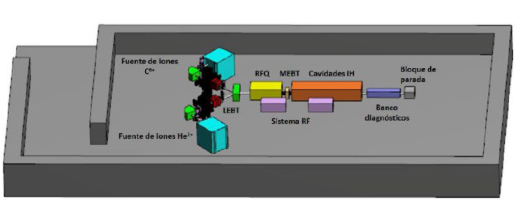 El proyecto LINAC6+ consiste en el diseño, fabricación, calibración y puesta a punto de un acelerador lineal de iones de C6+. Este proyecto tiene tres fases: un inyector que genera iones de baja energía hasta ≈10 MeV/nucleón, una etapa de aceleración que eleva su energía hasta ≈450 MeV/nucleón, y la etapa de deposición de dosis según requieran los requisitos clínicos. La propuesta que está ahora en marcha es la primera fase, por lo que coloquialmente podemos decir que estamos desarrollando un inyector de iones de C6+ (ver Figura 1). Este equipo está siendo desarrollado por empresas nacionales de la Industria de la Ciencia de España (https://www.induciencia.es/la-industria-de-la-ciencia/) lideradas por la empresa AVS (https://www.a-v-s.es/) con el soporte y apoyo científico-tecnológico de centros de investigación, laboratorios y universidades nacionales e internacionales, entre ellos el Centro de Investigaciones Energéticas, Medioambientales y Tecnológicas CIEMAT (https://www.ciemat.es/), y el CERN (https://home.cern/), que es el centro internacional más importante en física de aceleradores y física de partículas.