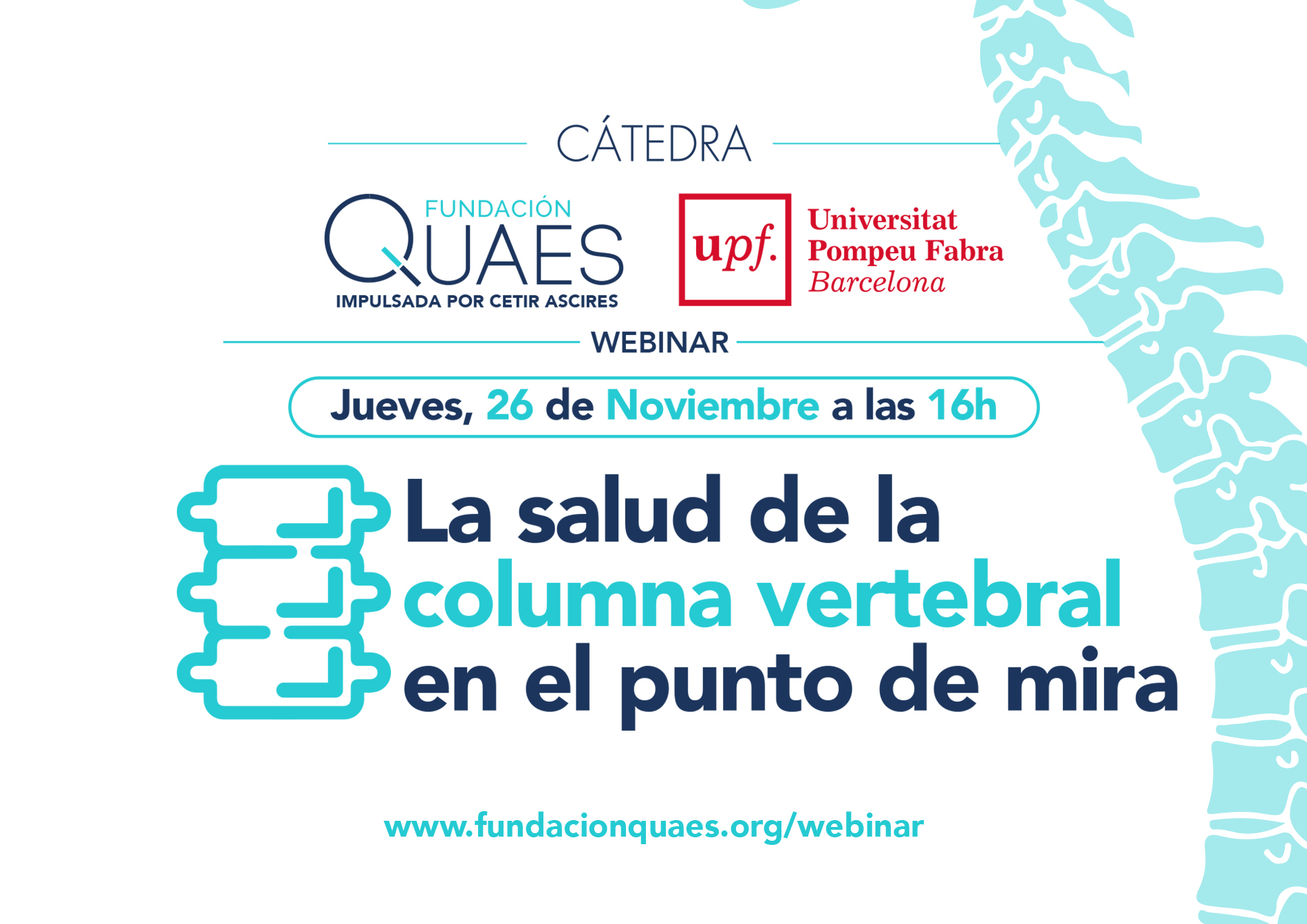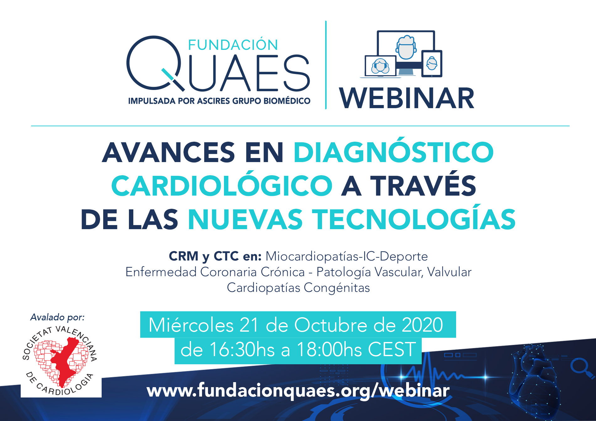 De acuerdo con lo dispuesto en el Reglamento (UE) 2016/679 del Parlamento Europeo y del Consejo, de 27 de abril de 2016, relativo a la protección de las personas físicas en lo que respecta al tratamiento de datos personales y a la libre circulación de estos datos, así como en la Ley Orgánica 3/2018, de 5 de diciembre, de Protección de Datos Personales y garantía de los derechos digitales, le informamos que sus datos pasarán a formar parte de un fichero propiedad de Fundación Quaes y ECG Médica S.L. y serán tratados con la finalidad de gestionar su inscripción a nuestros eventos. Sus datos no se cederán a terceros salvo requerimiento judicial y se mantendrán mientras no retire su consentimiento. Adicionalmente y si nos da su consentimiento, sus datos serán tratados con la finalidad de enviarle comunicaciones comerciales sobre productos y servicios prestados por Fundación QUAES, así como información general o eventos que pudieran resultar de su interés.