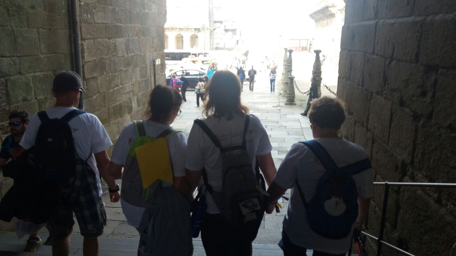 Suena una gaita. Es un túnel bastante oscuro en un día de sol radiante, aún con el contraste se vislumbran las camisetas blancas de la expedición. Nieves, Pilar y Ana, sin mediar una palabra, se cogen de la mano. Bajan cinco escalones y giran a la izquierda. Ante ellas la Plaza del Obradoiro. Su meta. La culminación de una aventura que no sólo ha durado seis días en los que han caminado 70 kilómetros, sino que les ha hecho soñar, padecer, temblar, compartir y sufrir a partes iguales durante más de un año.